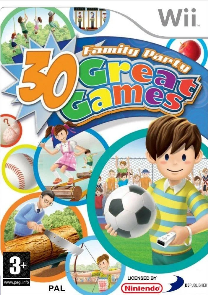 Family Party for Wii gives you 30 reasons to celebrate with 30 Great Games everyone can enjoy! Pick from 12 playable characters and frolic through a vibrant and colorful world you can't help but enjoy. Test your speed and athletic skill in hurdles and sprints, on an obstacle course, and in the high jump. Take aim in carnival games that use lasers and bows and arrows. Show off your strength in barrel tossing, rope climbing, and log tossing. Hit the playground for schoolyard fun with jump rope, a game of catch, and more. Multiple game modes offer turn-based and all-together play for one to four players.