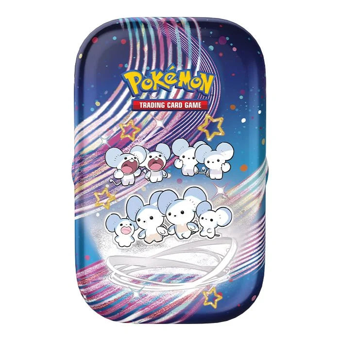 Pokémon Favorites in the Palm of Your Hand! In this Pokémon TCG: Scarlet & Violet—Paldean Fates Mini Tin, you’ll find: 2 Pokémon TCG: Scarlet & Violet—Paldean Fates booster packs, 1 sticker sheet, and a Pokémon art card showing the art from this Mini Tin—you can collect and combine all 5!